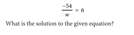 | What is the solution to the given equation? -54/w = 6 | For the function f, the graph of y=f(x) in the xy-plane has a slope of 3 and passes through the point (0, −8). Which equation defines f? A) f(x) = 3x B) f(x) = 3x − 8 C) f(x) = 3x + 5 D) f(x) = 3x + 11 |