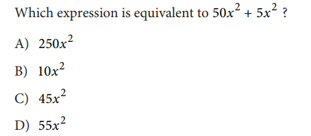 | Which expression is equivalent to 50x(squared) + 5x(squared)? A) 250x(squared) B) 10x(squared) C) 45x(squared) D) 55x(squared) | The population density of Cedar County is 230 people per square mile. The county has a population of 85,100 people. What is the area, in square miles, of Cedar County? |